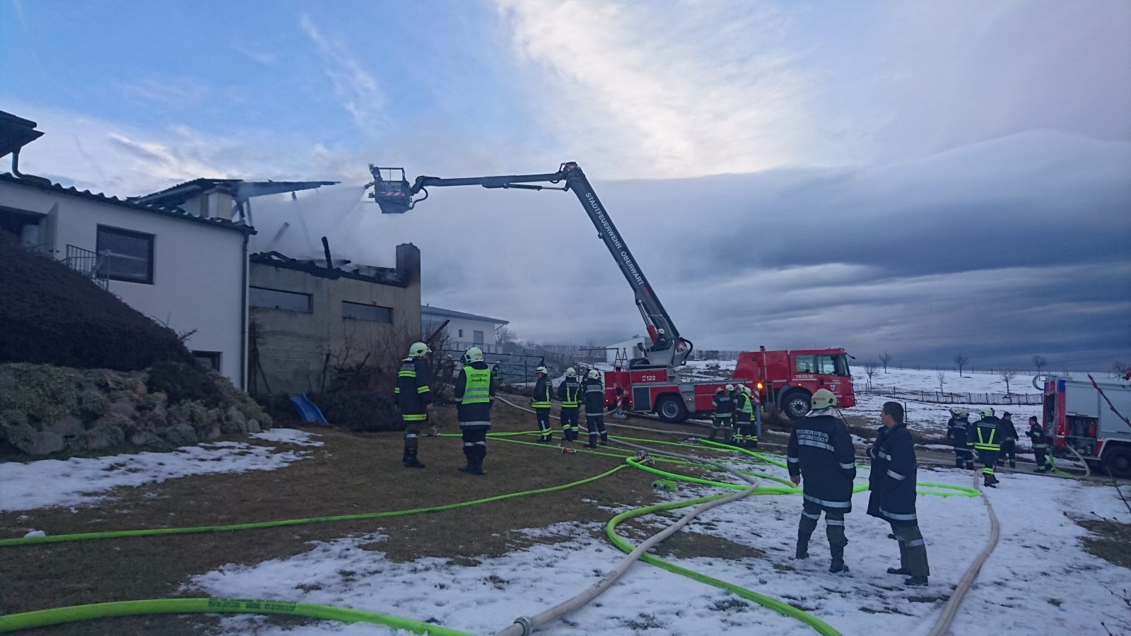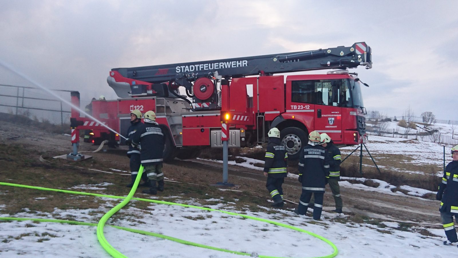 Am 14.01.2017 wurden wir kurz vor 8 Uhr zum Brandeinsatz nach Schmiedrait alarmiert. Wir fuhren mit TLF, KLF-A, MTF und 17 Mann zum Einsatzort. Aus ungeklärter Ursache ist eine Hackschnitzelanlage mit angrenzender Fahrzeughalle in Brand geraten. Das KLF-A und MTF errichtete eine Zubringerleitung vom Hydranten und da die Wasserreserven knapp waren wurde mittels TLF der Pendelverkehr aufgenommen um genügend Wasser zur Verfügung zu haben.
